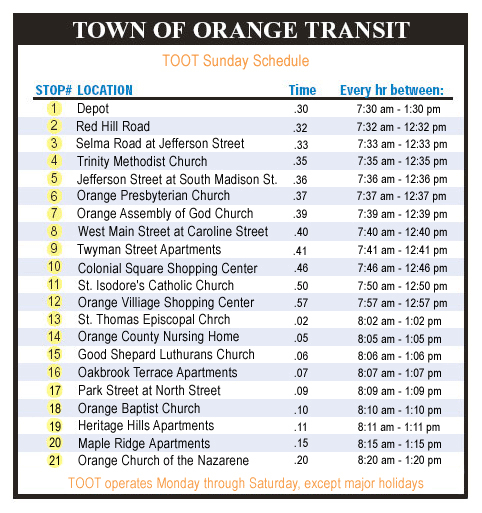 Let the Town of Orange Transit System take the frustration out of travel for only 25 cents each time you ride.